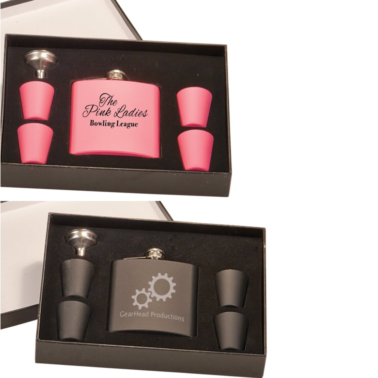 Nicely boxed for presentation, these flask sets come with a funnel and 4 shot glasses. The colored sets laser engrave very nicely.