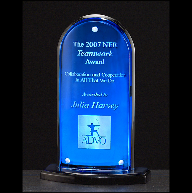 Acrylic arch (.625" thick) with blue mirror upright and base with convex acrylic front. Laser engraved from behind leaving the front smooth. Engraves white. Upright held in place with 3 magnets. The mirrored background causes the engraving to have an unusual shine and depth.