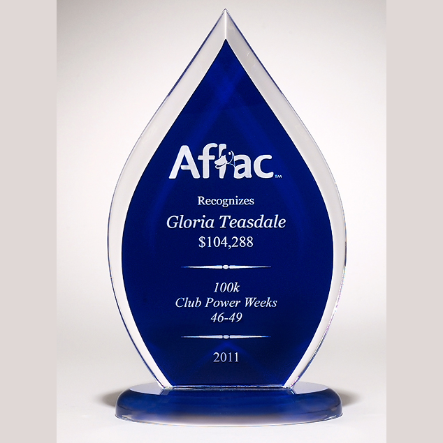 Acrylic flame with a deep blue center and clear bevel. The acrylic is .75" thick and sits on an oval blue acrylic base. We engrave these from the back, leaving the front smooth and, as the engraving is frosty white, the contrast is excellent.