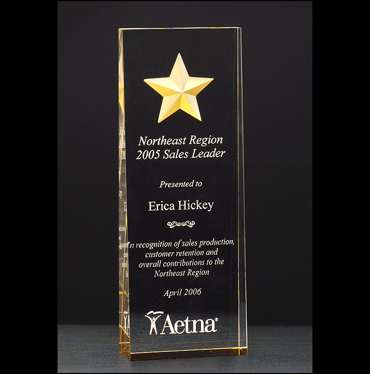 Acrylic Wedge with Etched, Paint-filled star. The bottom of the acrylic is 1.125" and tapers to .4375 at the top. We laser engrave from behind which leaves the front smooth and adds a 3D effect. Engraves white (can be paint-filled for an extra charge).