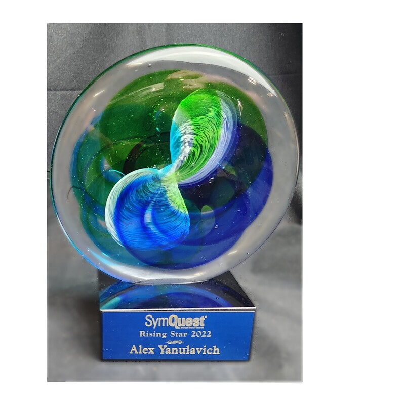 Art Glass award with brilliant blue and green accents on black base. Art glass pieces come with a black plate that engraves silver or gold, depending on the item. We have many metals in stock, and when given free reign by our clients, we prefer to choose one that brings out a color in the piece, making it especially unique.