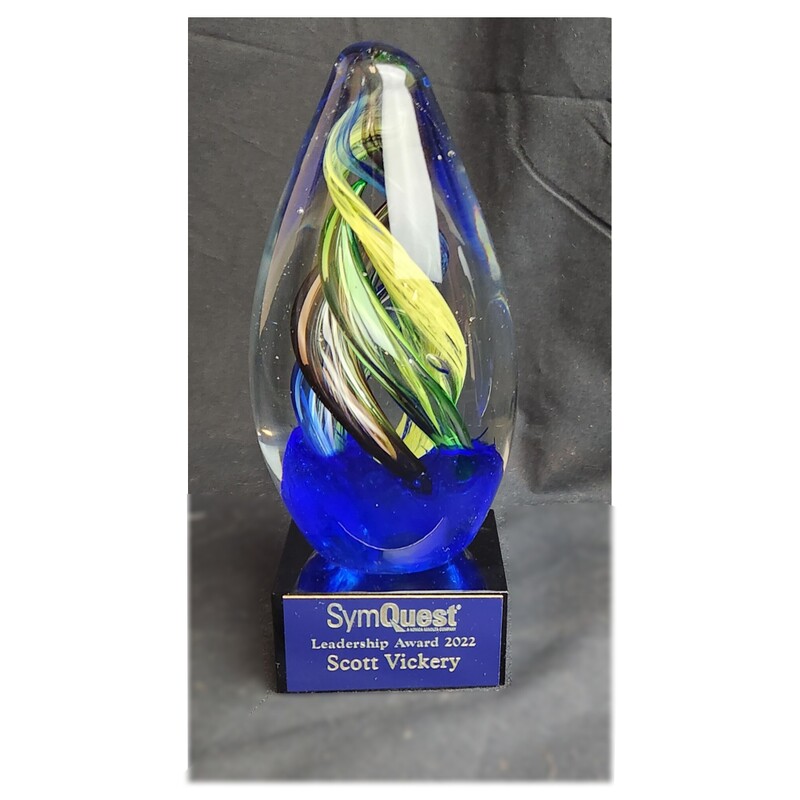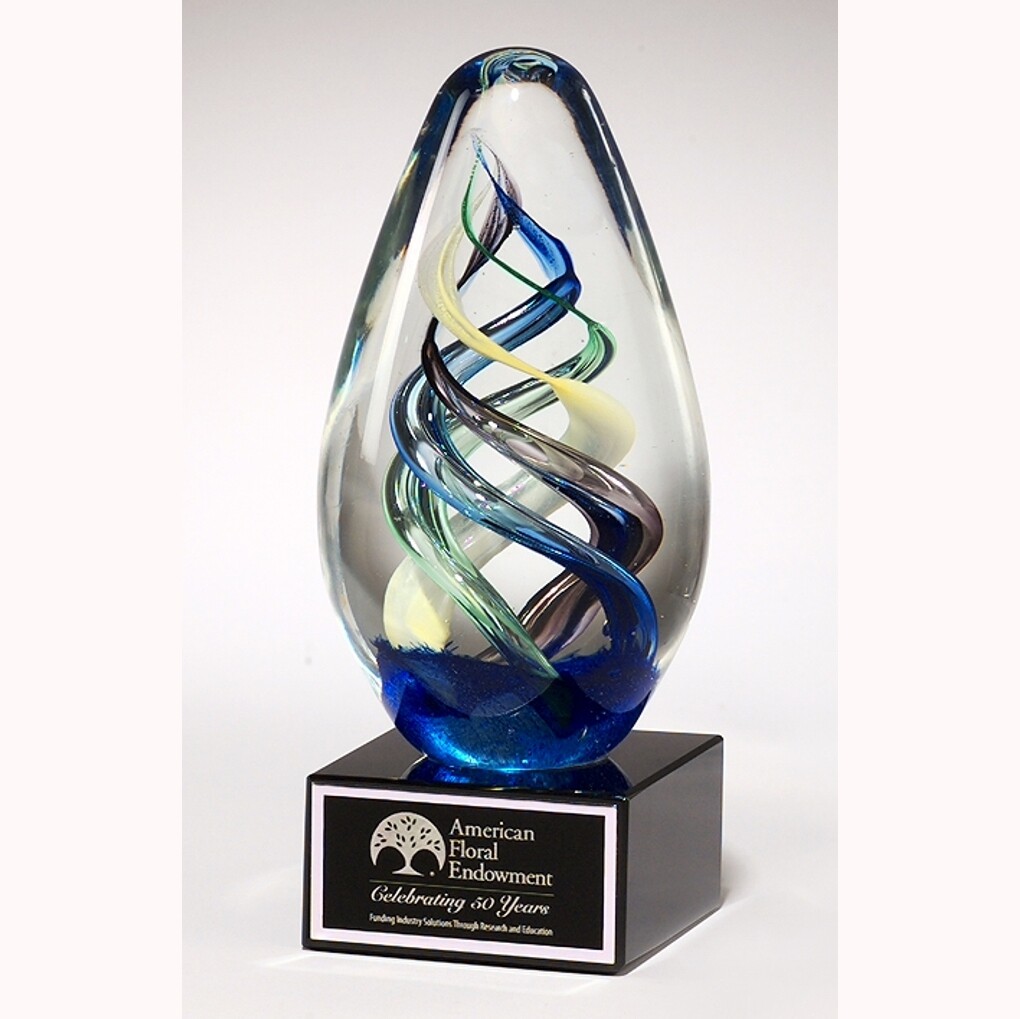 Art glass egg-shaped award on black glass base with blue, green, yellow, and grey spiraling toward the dome. Art glass pieces come with a black plate that engraves silver or gold, depending on the item. We have many metals in stock, and when given free reign by our clients, we prefer to choose one that brings out a color in the piece, making it especially unique.