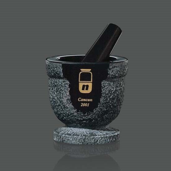 Very unique - a black marble mortar and pestle with space for a message. Sand carving is silver or gold-filled. We do these for the Albany College Of Pharmacy - could work well for a culinary graduate as well.