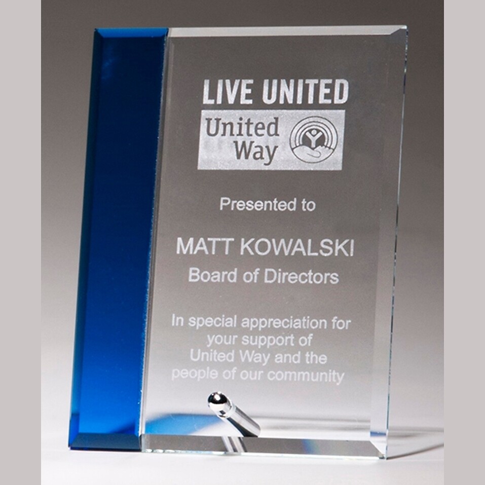 Clear glass rectangular award with blue glass accent. Stands with silver plated easel post. A very popular piece and a real value.
