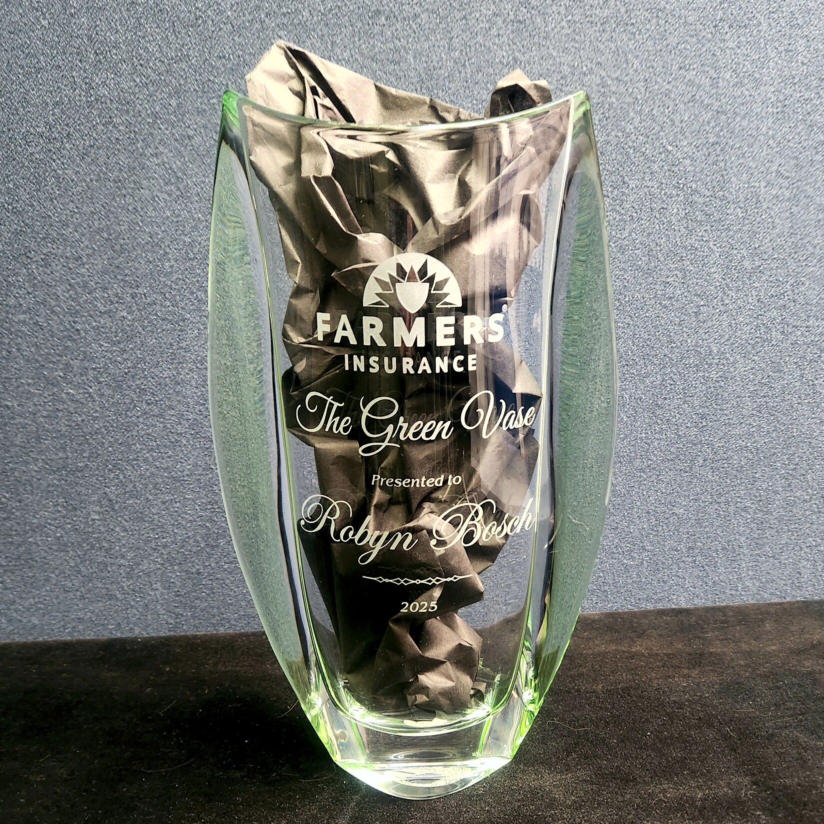 This large crystal vase with green accents is large and hefty - 5.375 lbs! It's clean lines are eye-catching and the smooth front and back allow your message and graphics to have center stage. A lovely and useful award or gift.