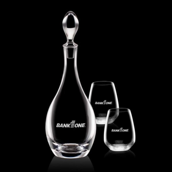 Elegantly-curved shape decanter, complete with a complimenting stopper in Lead-Free Crystalline with 2 or 4 glasses. (To better understand what Crystalline is see our Engraving & Design Tips (scroll down)). The deep etch adds depth and clarity to your graphic, logo or text. The glasses are 12 oz.