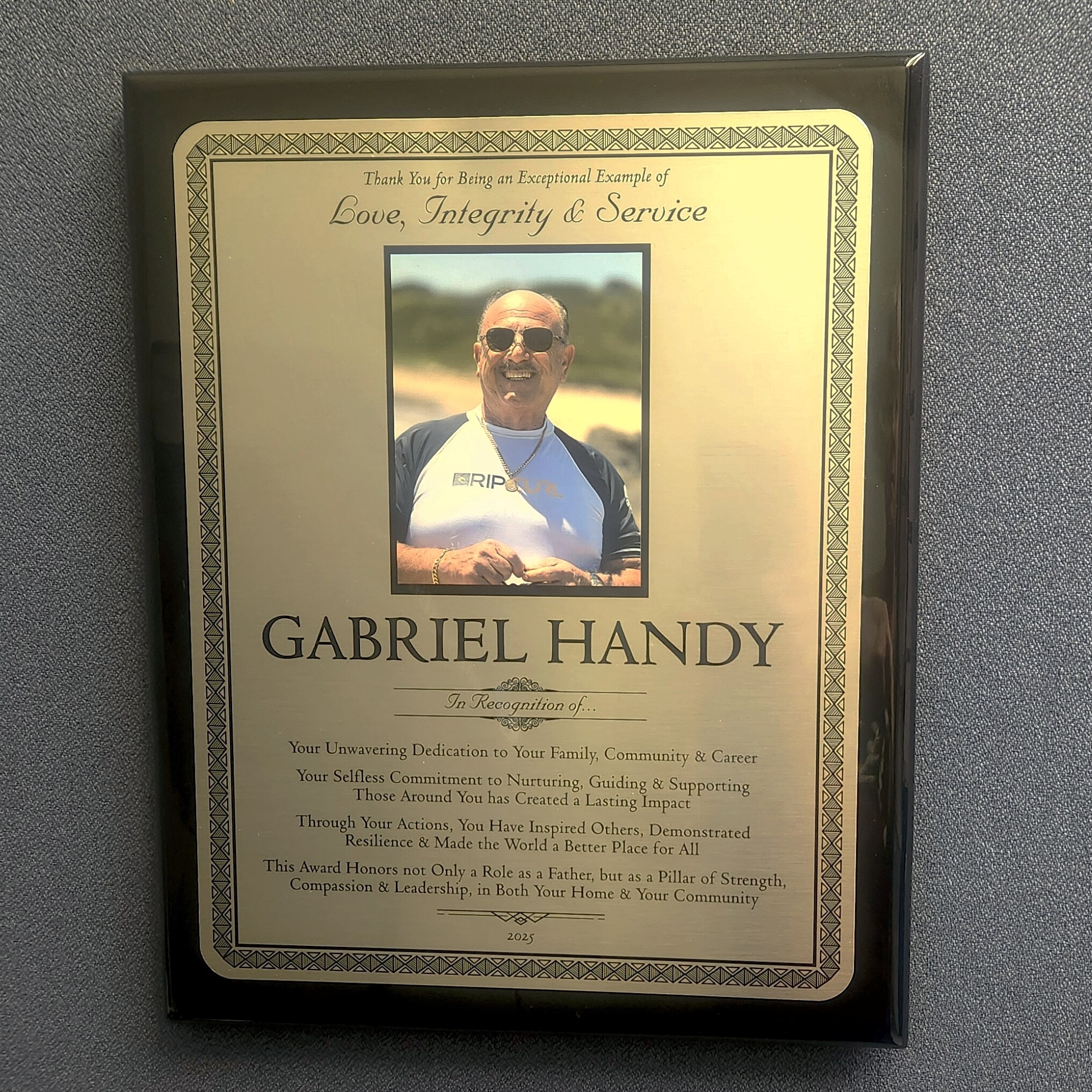 Beautiful hand rubbed piano finish plaque with full color sublimation on gold metal. Sublimation is a process that embeds dyes into coated metal - it is UV stable (won't fade) and permanent and unlike silk-screening it can't be picked off.