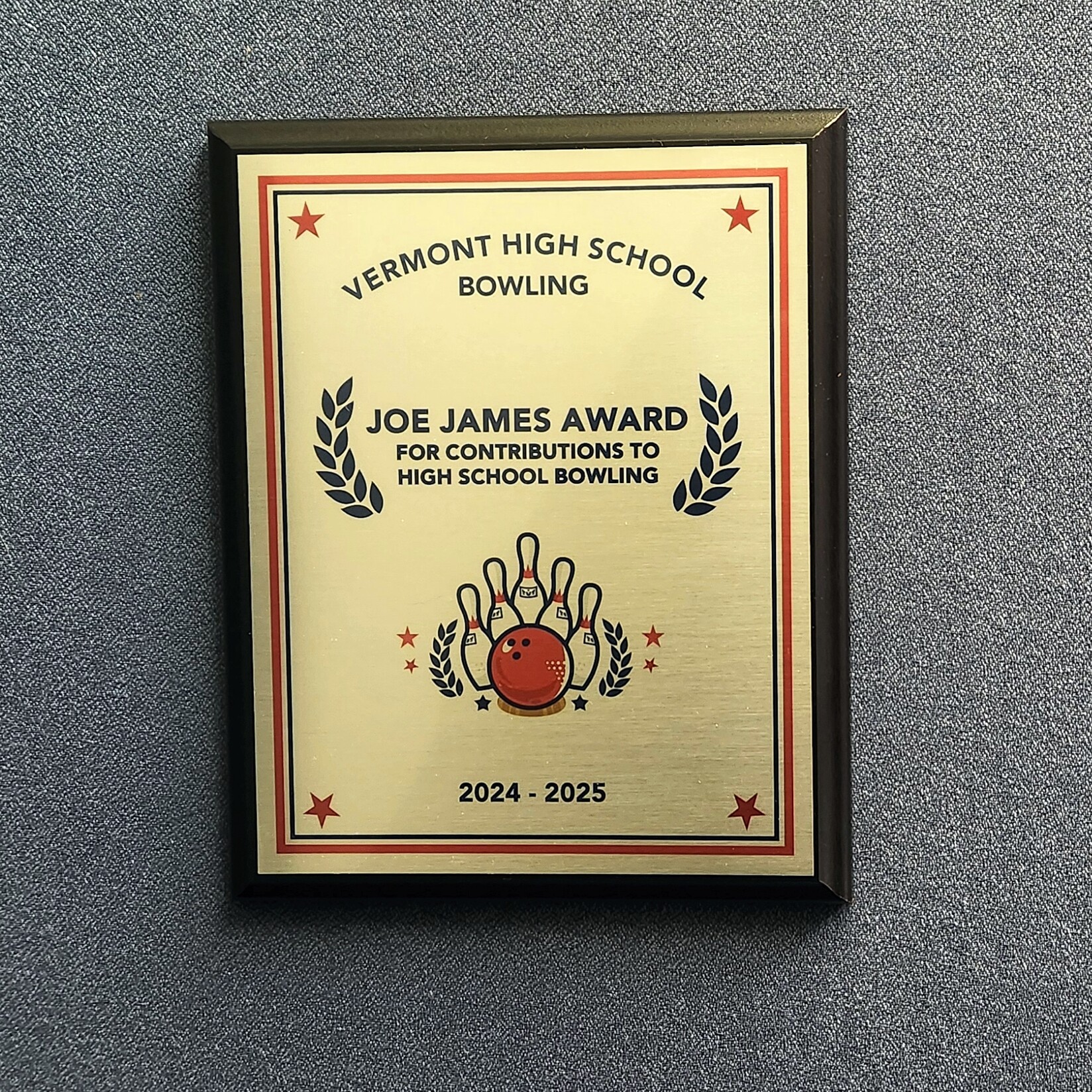 The vinyl plaque is a press board piece with a black matte finish. It is the most economical option and looks quite nice on presentation - it is not as durable as the solid wood options. Can be made to hang vertical or horizontal. Pricing on full color plaques is inclusive (no per letter charges apply).