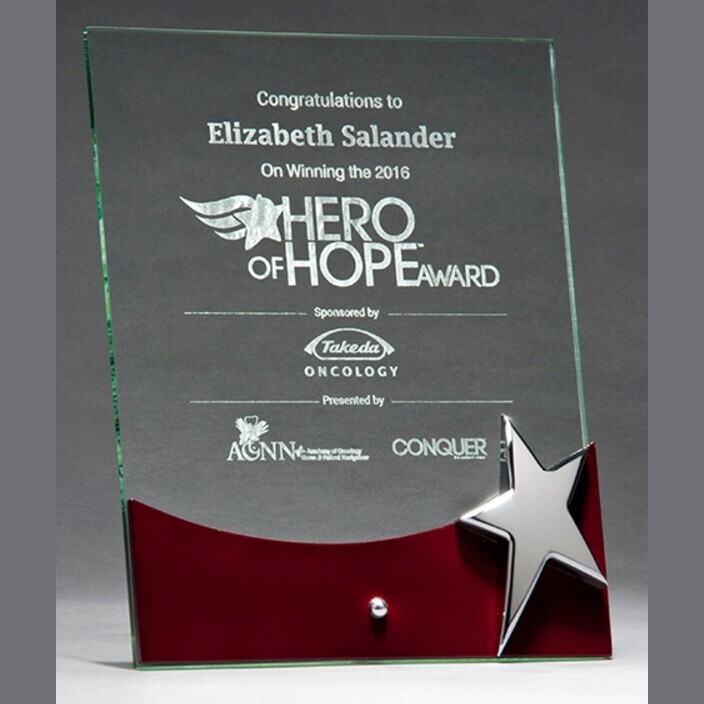 Clear glass is sand carved from behind leaving the front smooth. This method creates a deep cut that adds sparkle and depth to the piece. Stands with a silver pin, making for an easel effect. The silver star adds a focal point to the piece. Comes boxed.