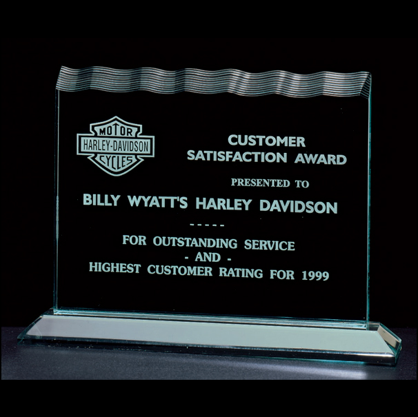 Jade acrylic (. 75" thick) horizontal rectangle with wave pattern top, on acrylic base. Engraved on back leaving front smooth. Engraves white.
