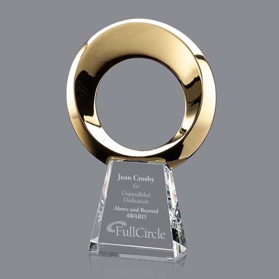 This is a massive, heavy, beautiful piece. We engraved one recently and it really is a show stopper, really spectacular - hand cast polished metal on lovely optical crystal bases in two sizes in gold or silver. Pictures show sand carving on the face - we prefer to etch on the back (a bit more complicated), which gives the etching more depth and interest. Comes in a nice presentation box.
