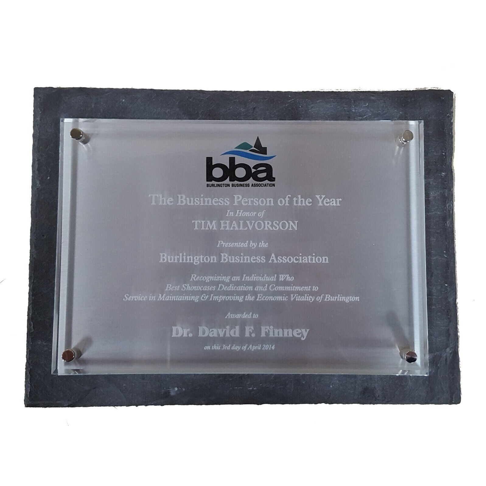 Made here, in our own shop, with Vermont roofing slate with uneven edges gives this custom plaque an industrial air while the full color sublimated plate and standoff hardware make this award very special.