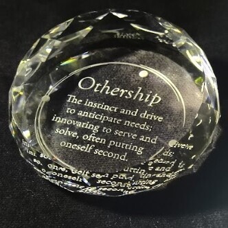 This is a really lovely piece with facets to catch the light. We sand carve these awards (similar to sand blasting, but with very fine grit and nozzles) from behind, leaving the front smooth. It makes for a lovely, deep etch that has depth and clarity. We can paint fill the etching, but we think it reduces the 3D look. Carved from behind, the front remains smooth, making this a truly elegant memento. Comes in a nice presentation box.